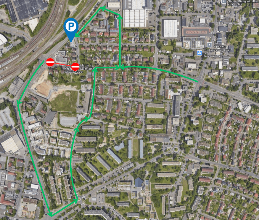 aufgrund einer Baustelle ist die direkte Zufahrt zu unserer Praxis derzeit gesperrt. Bitte folgen Sie der grün markierten Umleitung auf der Karte und planen Sie vorsorglich ein paar Minuten zusätzliche Zeit für Ihre Anfahrt ein.